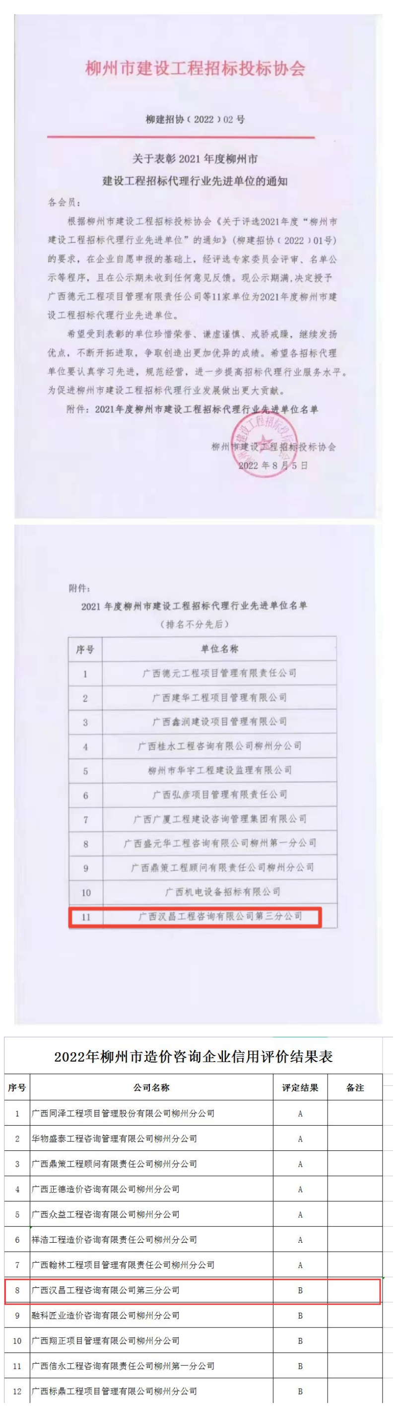 近期,汉昌咨询第三分公司荣获“2021年度柳州市建设工程招标代理行业先进单位”荣誉称号、2022年柳州市造价咨询企业信用评价B级,可喜可贺!