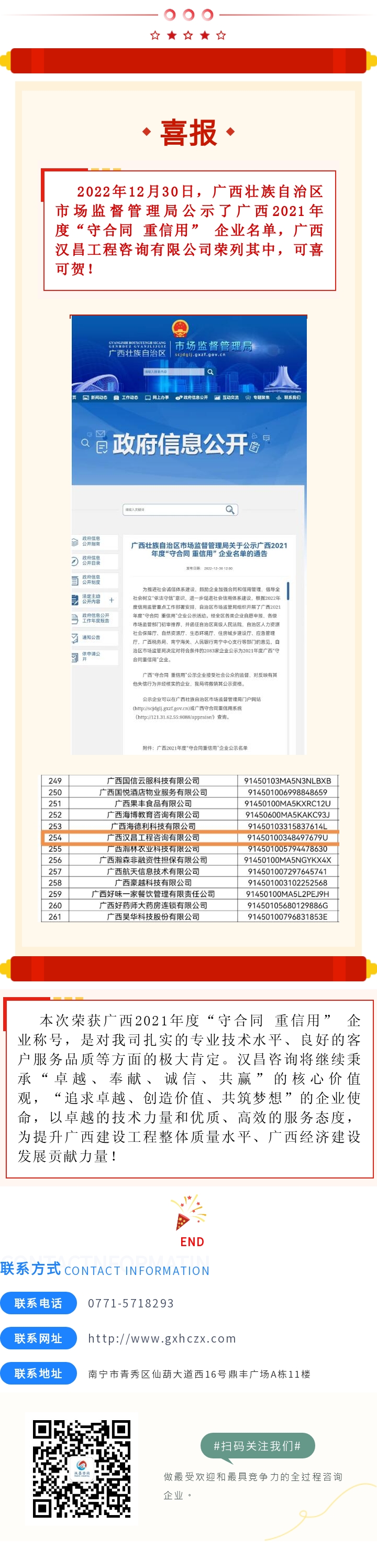 喜讯 | 汉昌咨询荣获广西2021年度“守合同 重信用” 企业称号