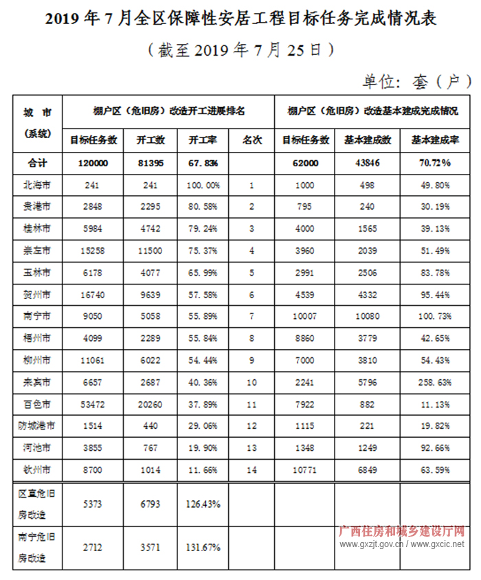 2019年截至7月底广西棚户区住房新开工改造8.14万套