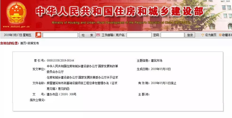 为贯彻落实中央城市工作会议精神和《国务院办公厅关于促进建筑业持续健康发展的意见》(国办发〔2017〕19号)要求,加快推进工程总承包,完善工程总承包管理制度,提升工程建设质量和效益,我们组织起草了《房屋建筑和市政基础设施项目工程总承包管理办法(征求意见稿)》。现送你单位征求意见,请各省级住房和城乡建设主管部门、发展改革部门于2019年5月31日前,分别将意见函告住房和城乡建设部建筑市场监管司、国家发展改革委投资司,并请发送电子版。